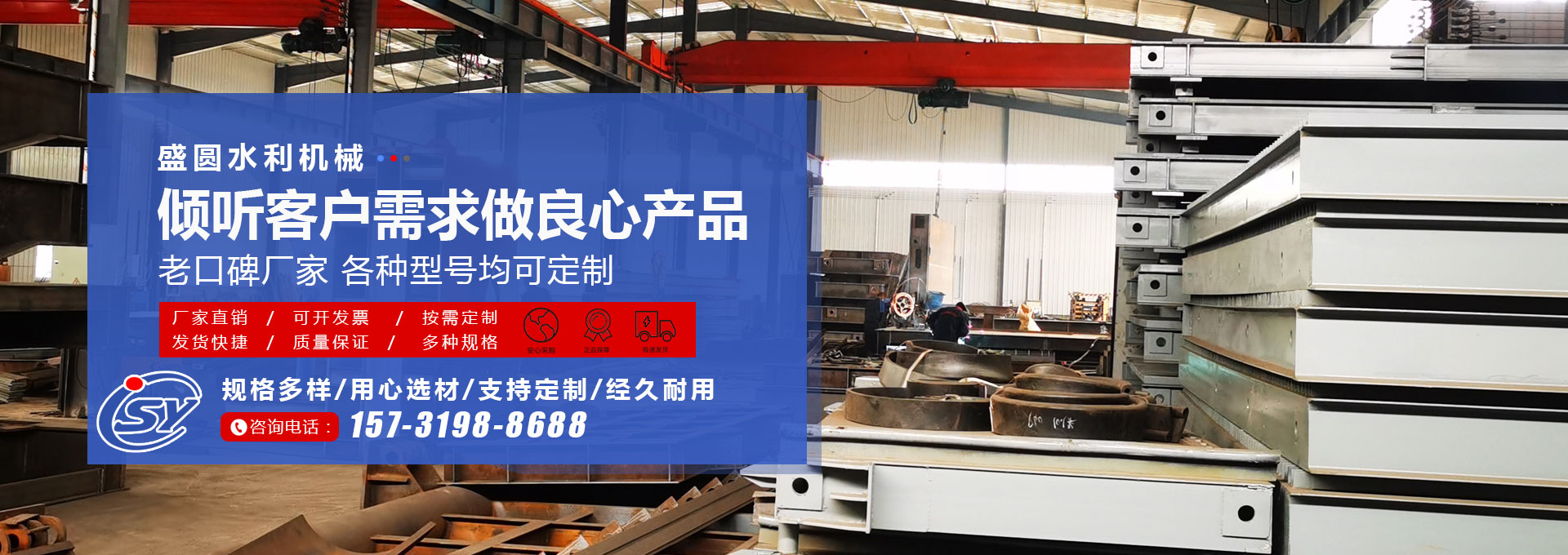 衡水盛圆水利机械有限公司是一家专业设计、制造、批量生产及指导安装水工机械的综合性企业。 我公司集设计、开发、生产、施工为一体,专业生产钢制闸门、铸铁闸门、不锈钢闸门,QL型、QLC型、QLP型螺杆启闭机,QPQ、QPK、QPH、QPT型卷扬启闭机启闭机,玻璃钢拍门、钢拍门、不锈钢拍门、拦污栅、回转式清污机、橡胶止水带等水工产品。 多年来,公司依靠优良的产品质量、合理的产品价格、热情周到的售后服务,产品被广泛用于水利工程项目中,并赢得了广大用户的信赖与赞誉。 主导产品: 1、螺杆式启闭···